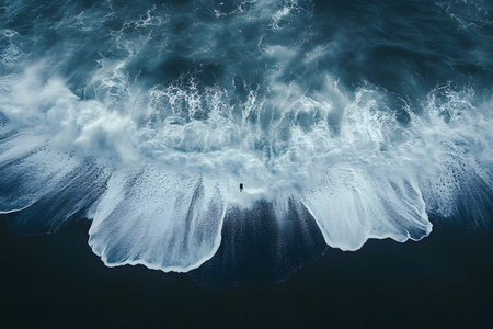 Aerial perspective of ocean waves creating intricate patterns as they crash onto a dark beach. the powerful movement of water and foam reflects nature's beauty and strength, capturing the essence of coastal dynamics. Generative AI