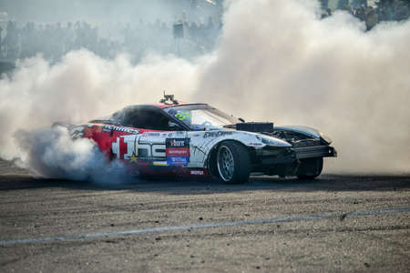 Odessa, Ukraine - August, 12, 2012. Ukrainian Drift Championship, 3rd stage, East European Drift Championship, 5th stage. Drift sport car in sharp sideslip. A lot of smoke