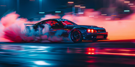 a high speed drift car slides through a wet neon lit city street at night with tire smoke and graffiti art visuals capturing urban racing energy and cinematic cyberpunk style