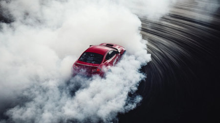 An overhead shot depicts a red car engaged in drifting, generating a cloud of smoke. The vehicle is positioned on a circular track, with visible tire marks and concrete barriers. The scene is illuminated with natural light, showcasing a dynamic composition suitable for commercial or editorial applications.