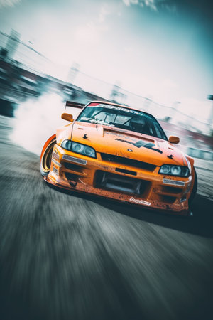 a modified drift car slides through a smoky turn on an urban racetrack during sunset showcasing speed control and motorsport energy