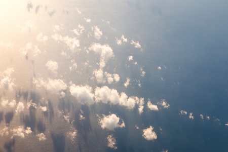 Banner 3:1. Blue sky with fluffy clouds. Aerial view from airplane window