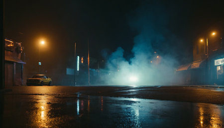 high speed night drift car with glowing headlights and tire smoke captured in motion blur on urban road