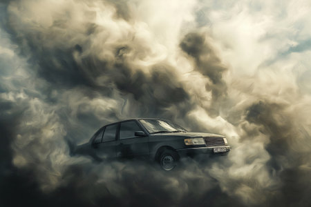 Old car driving alone surrounded by a thick cloud of toxic smoke, contributing to air and environmental pollution
