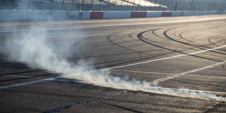 Tire smoke rises on the racetrack, marking a recent intense competition. The hot afternoon sun shines brightly over the track, highlighting the tire marks left behind.
