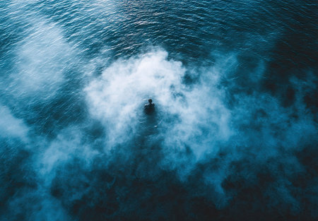 An aerial perspective captures a figure in a body of water shrouded by mist. The composition showcases cool tones and a soft, diffused lighting effect, creating an ethereal mood. The image could be suitable for editorial content or as an artistic element in design projects.