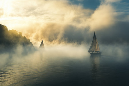 Two sailboats glide silently through thick fog on calm waters during early morning light.