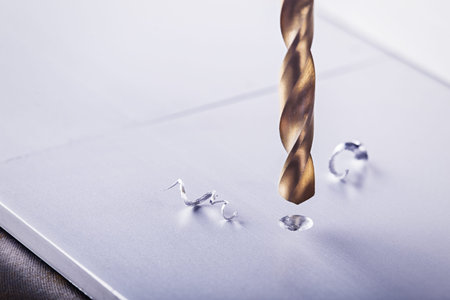 Drilling process with shavings close-up at the workplace in workshop