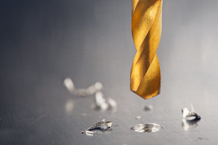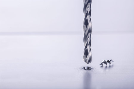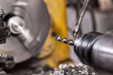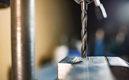 Close-up of a drill the process of drilling an iron workpiece.