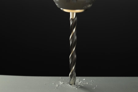 Drilling hole in gray surface on black background, closeup