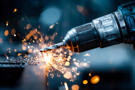 A detailed shot of a handheld electric drill igniting fiery sparks as it grinds metal in a busy workshop environment, highlighting craftsmanship and i