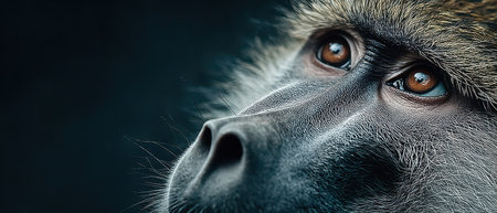 A baboon gazes quietly with intense eyes showcasing its unique features in soft light against a dark background.