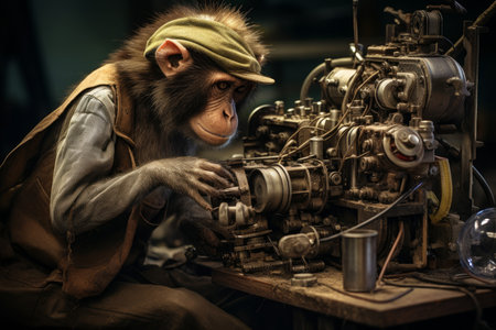 A monkey in workwear fixing machinery with focus and expertise