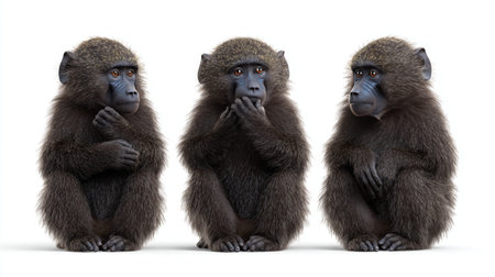 A three baboon see no evil speak no evil hear no evil monkey animal comedy concept white background furry trio baboon trio posing with comic see no