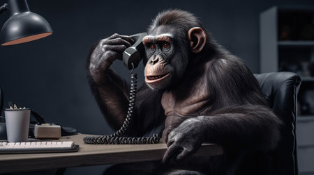 Chimpanzee sitting at the desk and talking on the phone