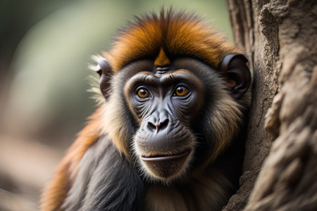 A close-up view of a monkey's face with a blurry background. This image can be used to depict wildlife, nature, or animal behavior.