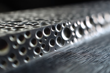 A steel plate with round perforations scattered across its surface, focusing on the precision of the drilled holes in an industrial context.