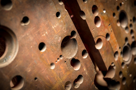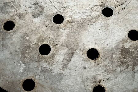 Round black holes in an old metal surface close-up. Selective focus. Abstract background.
