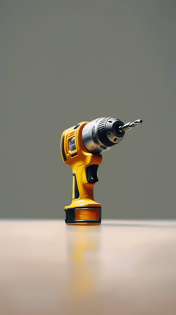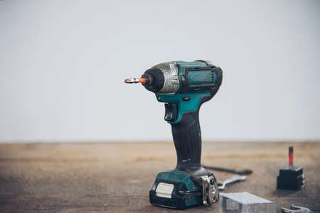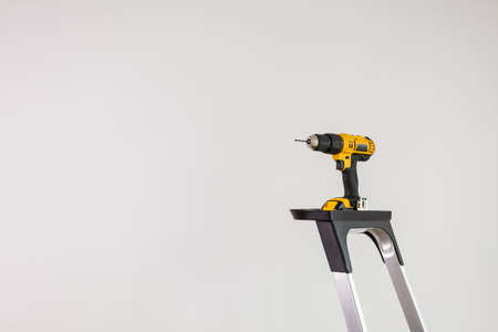 Repairing, work tools. Professional battery drill standing on ladder. Gray light white background with copyspace.