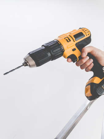 Hand with cordless screwdriver and drill isolated on white background. Twists screws into the board. Selective focus