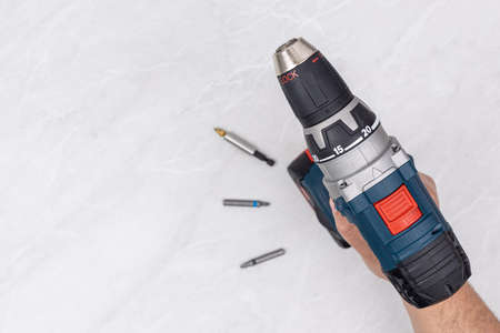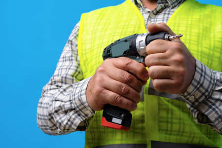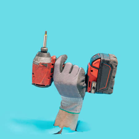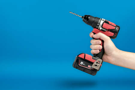 Cordless screwdriver in hand. Cordless tool in a mans hand. The concept of repair and construction on a blue background.