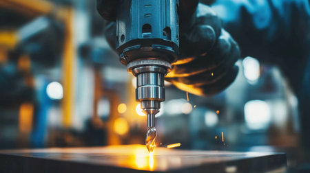 A close-up shot of an electric drill engaged in metalwork, emitting bright sparks in a dynamic workshop environment, showcasing precision and expertise.