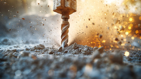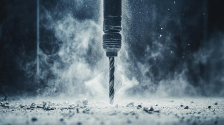 A dramatic close-up of an electric drill penetrating the ground, creating a cloud of dust in an industrial setting. The scene highlights the power and precision of tools in construction work, showcasing the dynamic interaction between machinery and material.