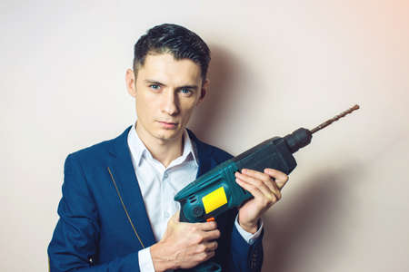 young man in suit holds in hand a power drill and works with it as a weapon, a businessman for dirty work