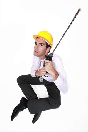 Businessman holding drill with long attachment