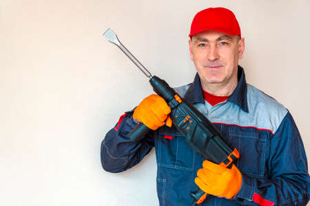 workman with a rotary hammer. worker, professional with hammer drill perforator. copyspace.