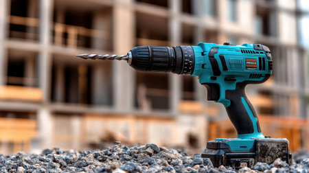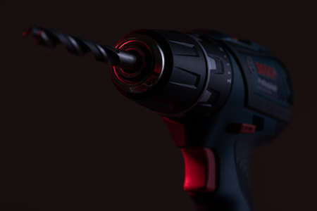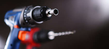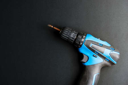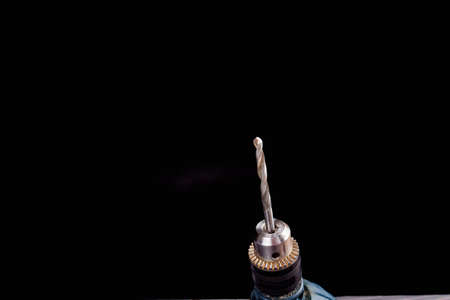 powerful drill with a drill inserted close up on a dark background.