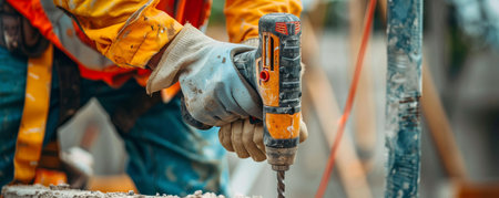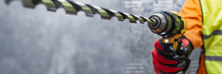 Construction worker holding an electric drill with a long spiral bit. Concept of industrial work, renovation and precision engineering. Concept for power tools and professional craftsmanship
