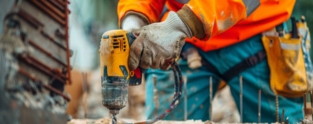 A close-up view depicts a worker using a drill to bore into a metal rod on a construction site. The image displays a shallow depth of field, with the tool in sharp focus. The scene, shot in natural light, shows other workers and dust in the background. It is suitable for illustrating construction, engineering, or industrial themes.