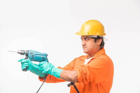 Indian electrician engineer in action with wire cutter, drilling machine etc, standing isolated over white background