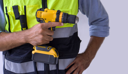 A yellow cordless electric drill with battery in the hand of a construction worker wearing an green reflective safety vest. Close up