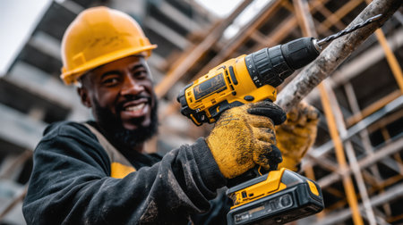 A construction worker shows enthusiasm while using a power drill on site, dressed in safety gear. The background features an active building project, emphasizing industry vitality.