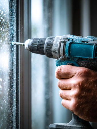 A focused craftsman in casual attire carefully secures a glass panel with a cordless drill, highlighting craftsmanship and precision during a home improvement project.