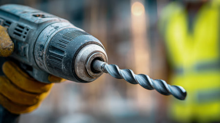 A construction worker grips an aged power drill featuring a twisted metal bit, standing amidst a hazy outdoor site with a safety vest subtly visible in daylight.