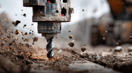 A heavy-duty drill bit is engaged in boring into the earth, sending up a spray of dirt and debris around it. The scene captures the powerful action of construction work.