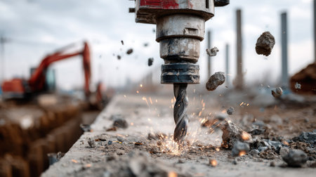 A drilling machine operates on a construction site, creating sparks and debris as it pierces the ground. Heavy machinery and workers surround the active area, showcasing industrial processes.