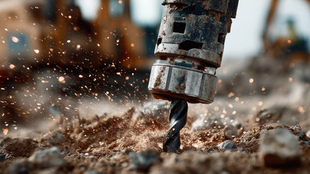 A powerful drilling machine creates sparks and removes dirt on a construction site. The close-up shows the precision and strength required for heavy-duty work.