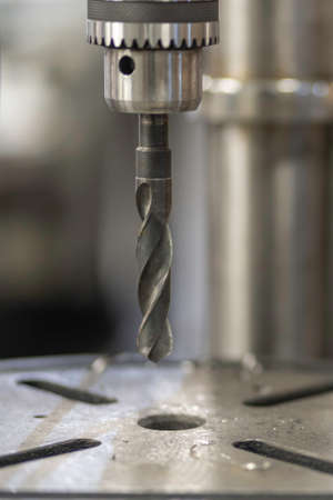 metal drill bit make holes in steel billet on industrial drilling machine with shavings. Metal work industry. multi cutting tool and end mill.