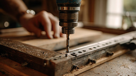 A detailed close-up of an electric drill being used on a wooden surface in a workshop. The image captures the essence of craftsmanship, featuring wood shavings and a skilled hand in the background, conveying the dedication and creativity involved in woodworking projects.
