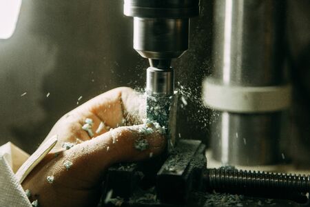 Drilling hole in the metal with giant drill at steel factory by worker male.