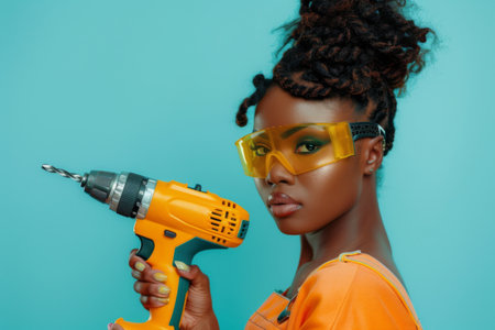 A confident person with a bright orange power drill displays bold style and creativity, wearing protective goggles and embodied modern craftsmanship against a vibrant blue backdrop.