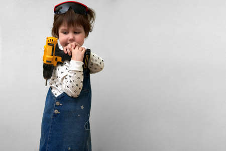 A little girl with a cordless screwdriver on her shoulder. copyspace.