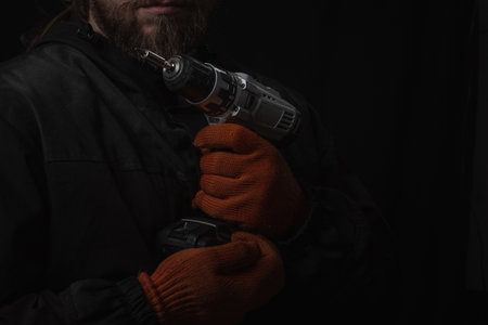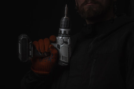 Master Builder-finisher in work clothes, with a drill screwdriver in hand for any purpose
