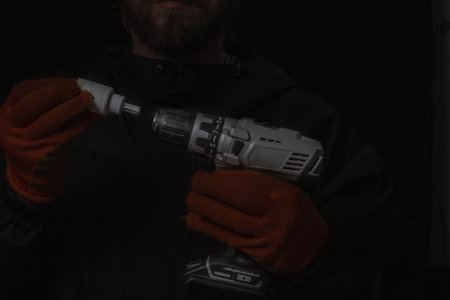 Electric screwdriver in the hands of a carpenter. Male hands in work gloves hold an electric screwdriver.