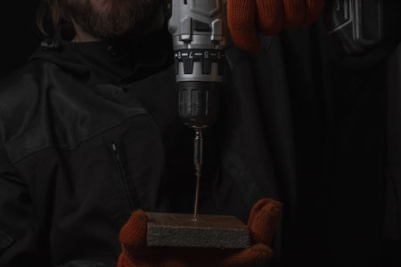 close up of african man builder in uniform drills a wall with a modern drill