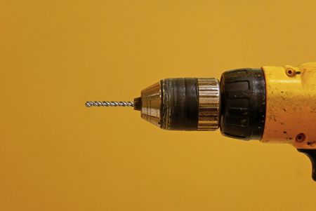 old yellow drill with new cement drill bit against yellowish background